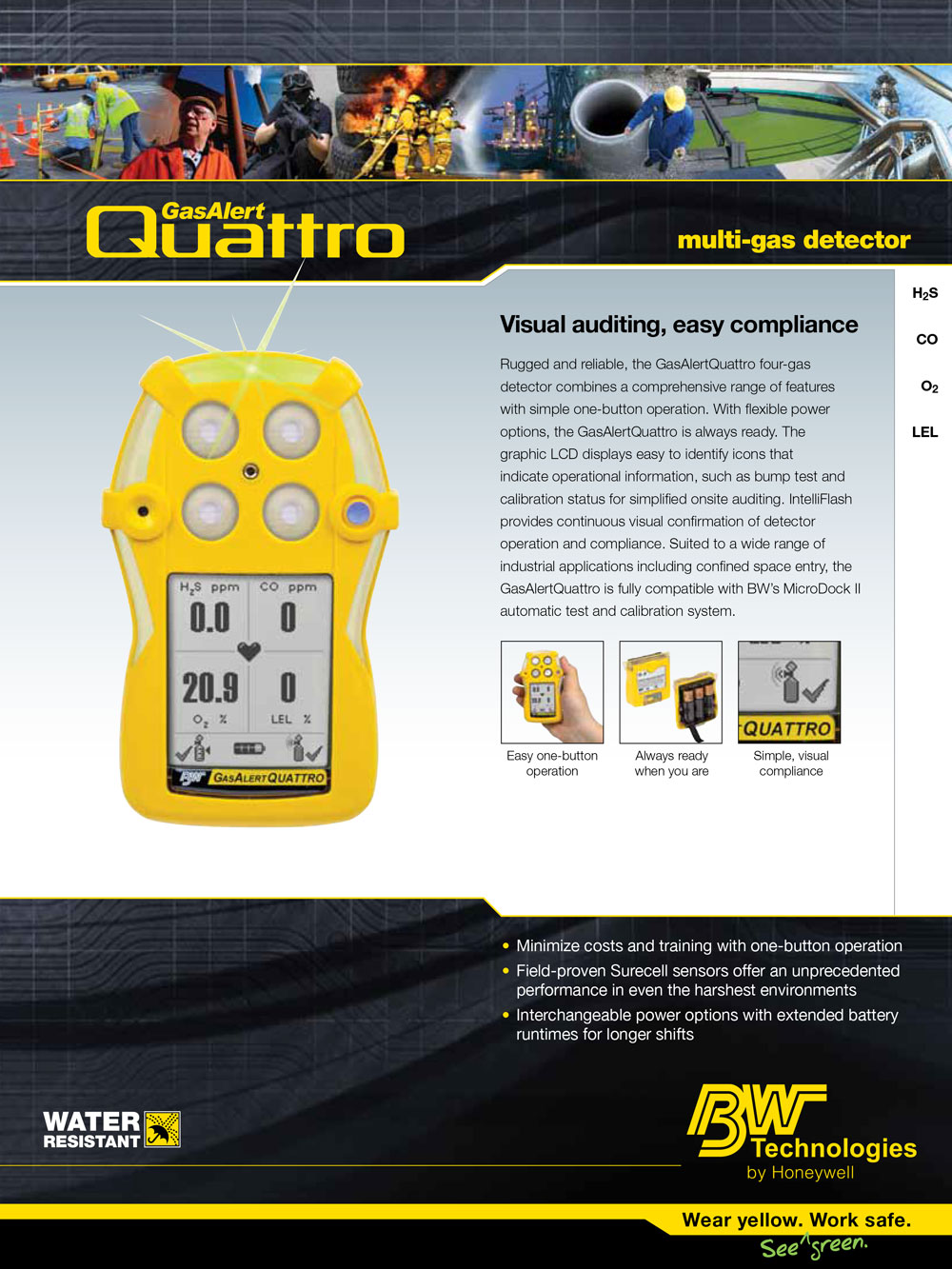 GasAlert Quattro, adalah Tipe Multi gas dengan P/N: QT-XWHM-R-Y-OE, Ini adalah alat untuk pendeteksi kebocoran Gas di area Kerja yang mudah meledak, Jenis Gas ini Multi Gas detector yang bisa mendeteksi hingga 4 Gas sekaligus dalam satu alat Yaitu : H2S, CO, O2 dan %LEL. Audible, Visual dan Getaran alarm memberikan pemberitahuan waspada terhadap kondisi yang tidak aman sementara datalogging download memberikan paparan pelaporan. sangat sederhana sehingga nyaman dipakai, dan Produk ini dikalibrasi selama 6 bulan sekali dan sudah BerCertificate Resmi dari BW Technologies by Honeywell, Produk ini mempunyai Garansi 2 Tahun. Tipe ini batery sangat mudah di ganti bila rusak dan anda bisa mendapatkan batery dari pasaran atau dengan yang original dari BW.